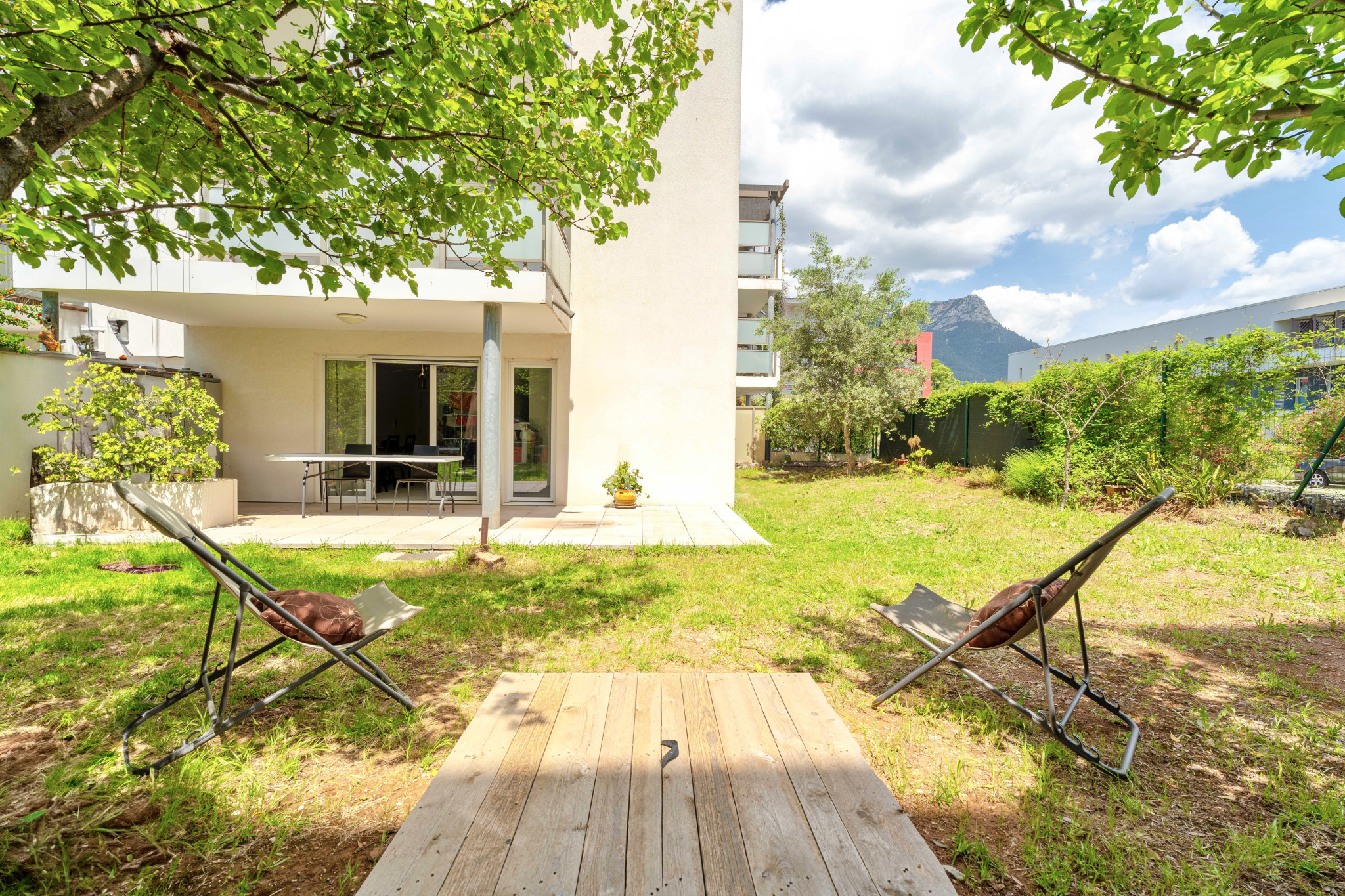 L’appartement se compose d’un séjour spacieux et lumineux avec cuisine ouverte, donnant sur une agréable terrasse couverte de 20 m² prolongée par un grand jardin privatif de 200 m², idéal pour vos moments de détente en extérieur.