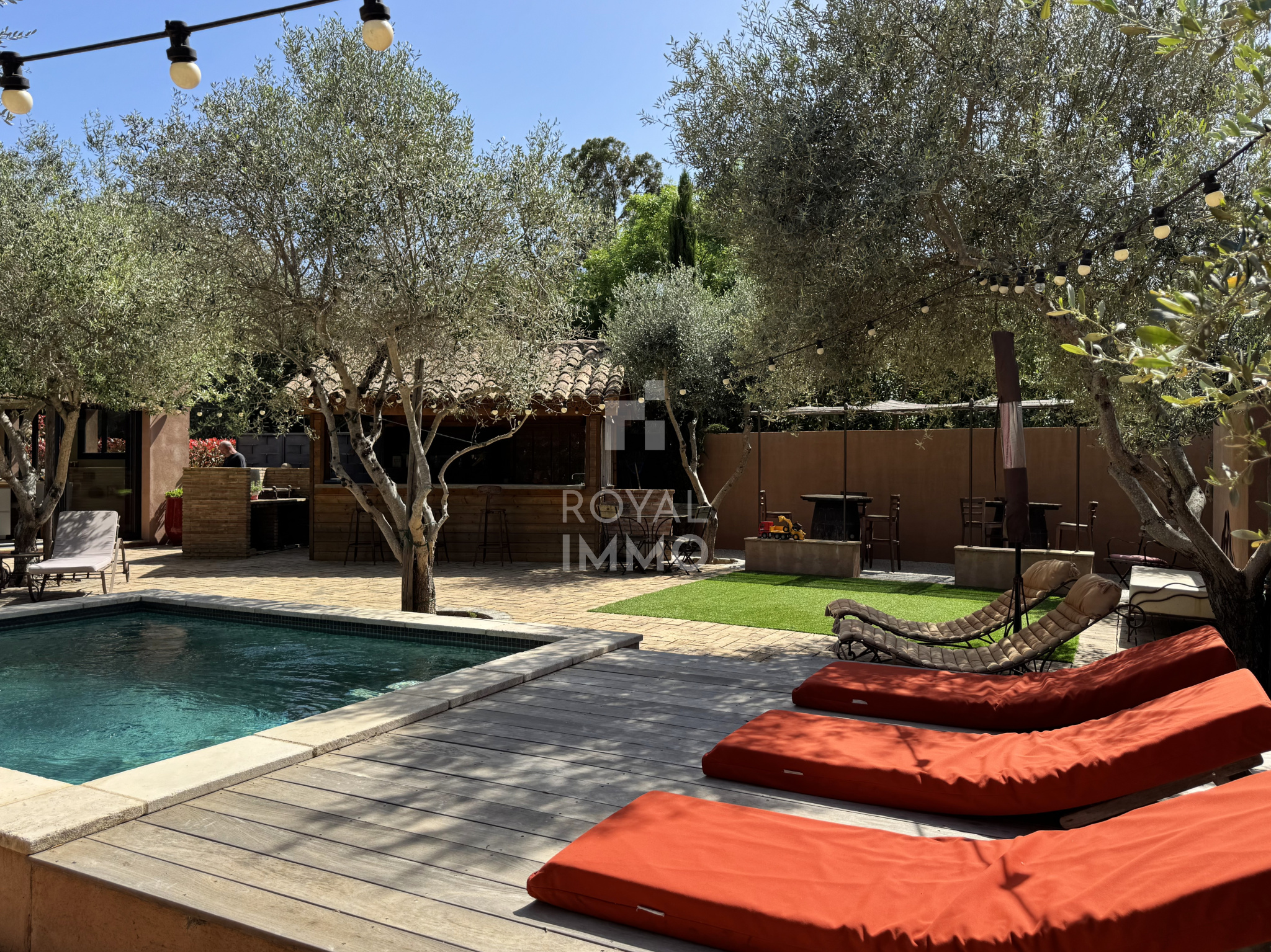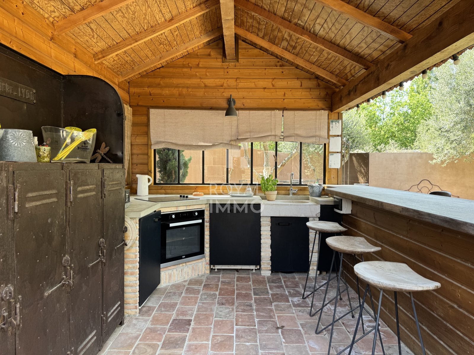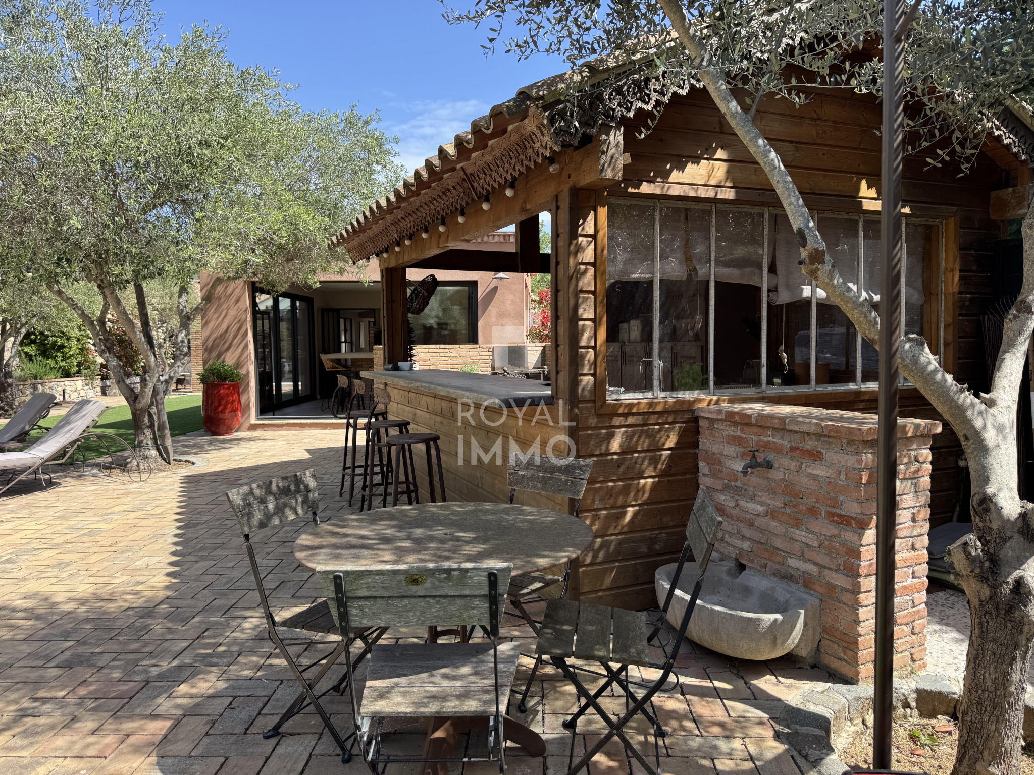Une cuisine d'été équipée fait face à ces deux bâtis et encadre magnifiquement l'espace piscine.