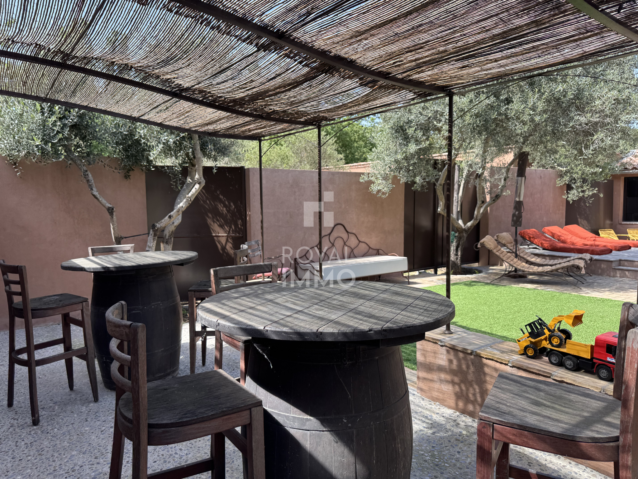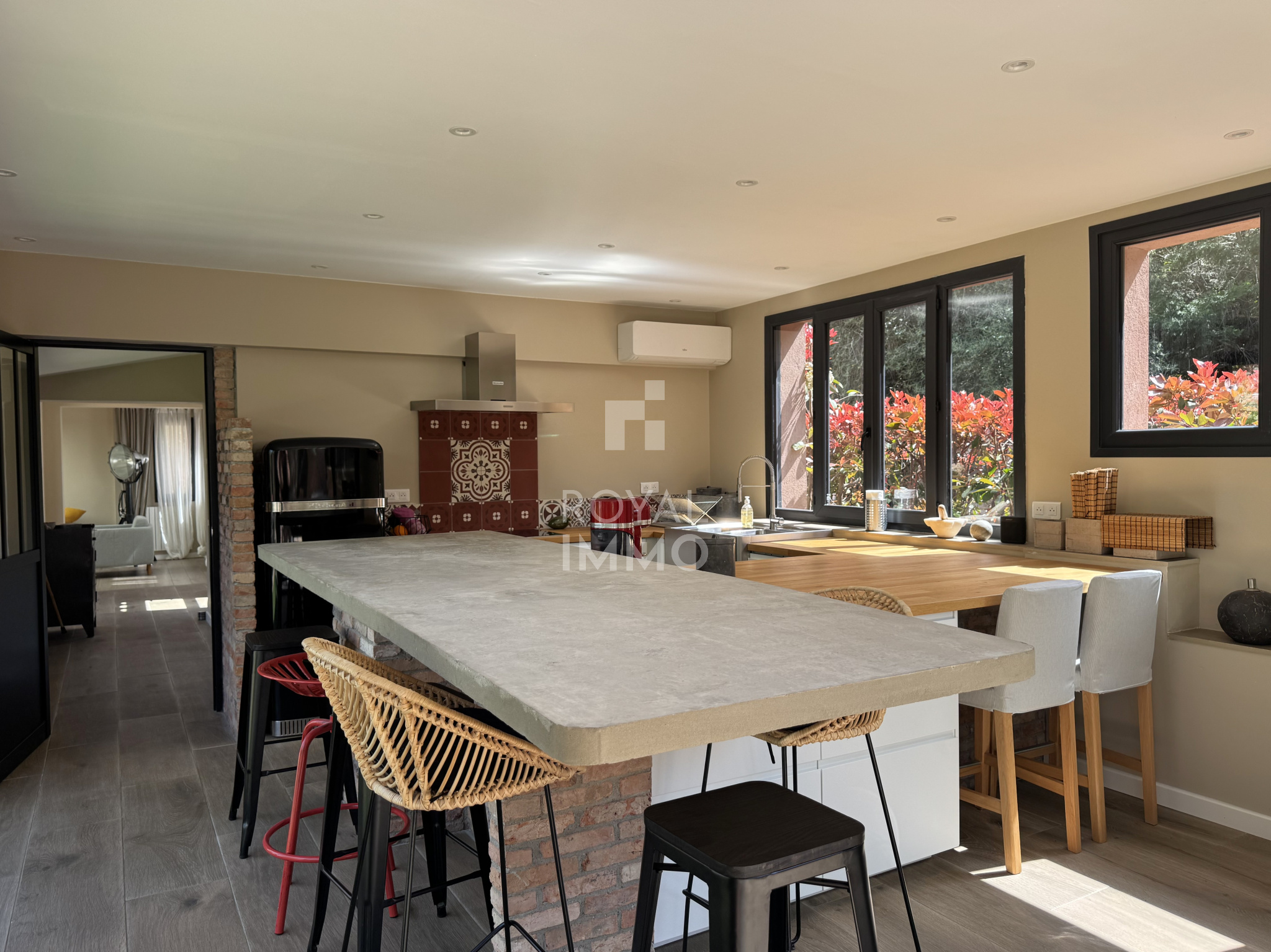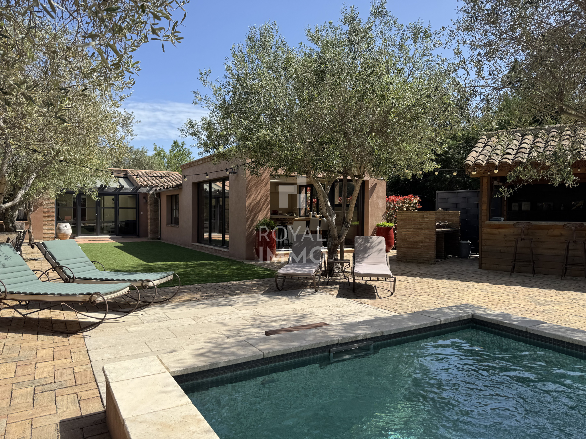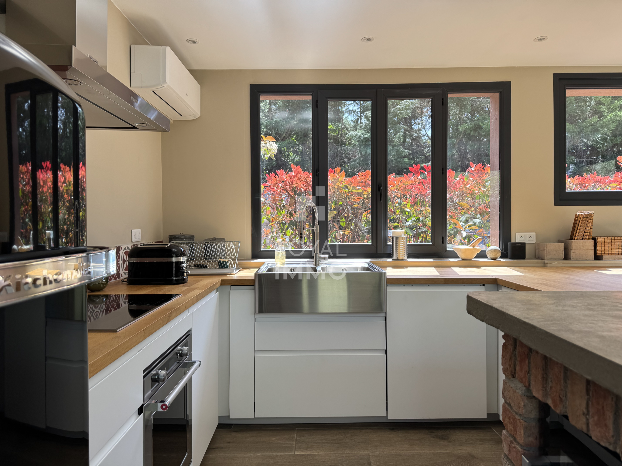 Une cuisine d'été équipée fait face à ces deux bâtis et encadre magnifiquement l'espace piscine.