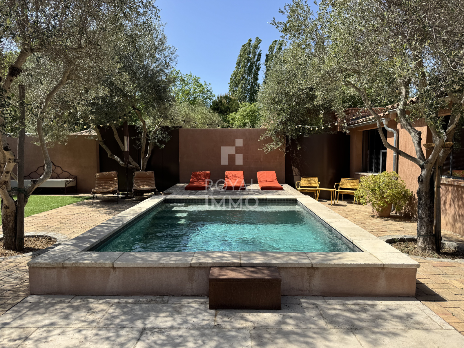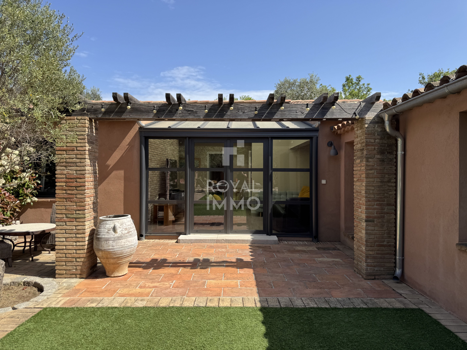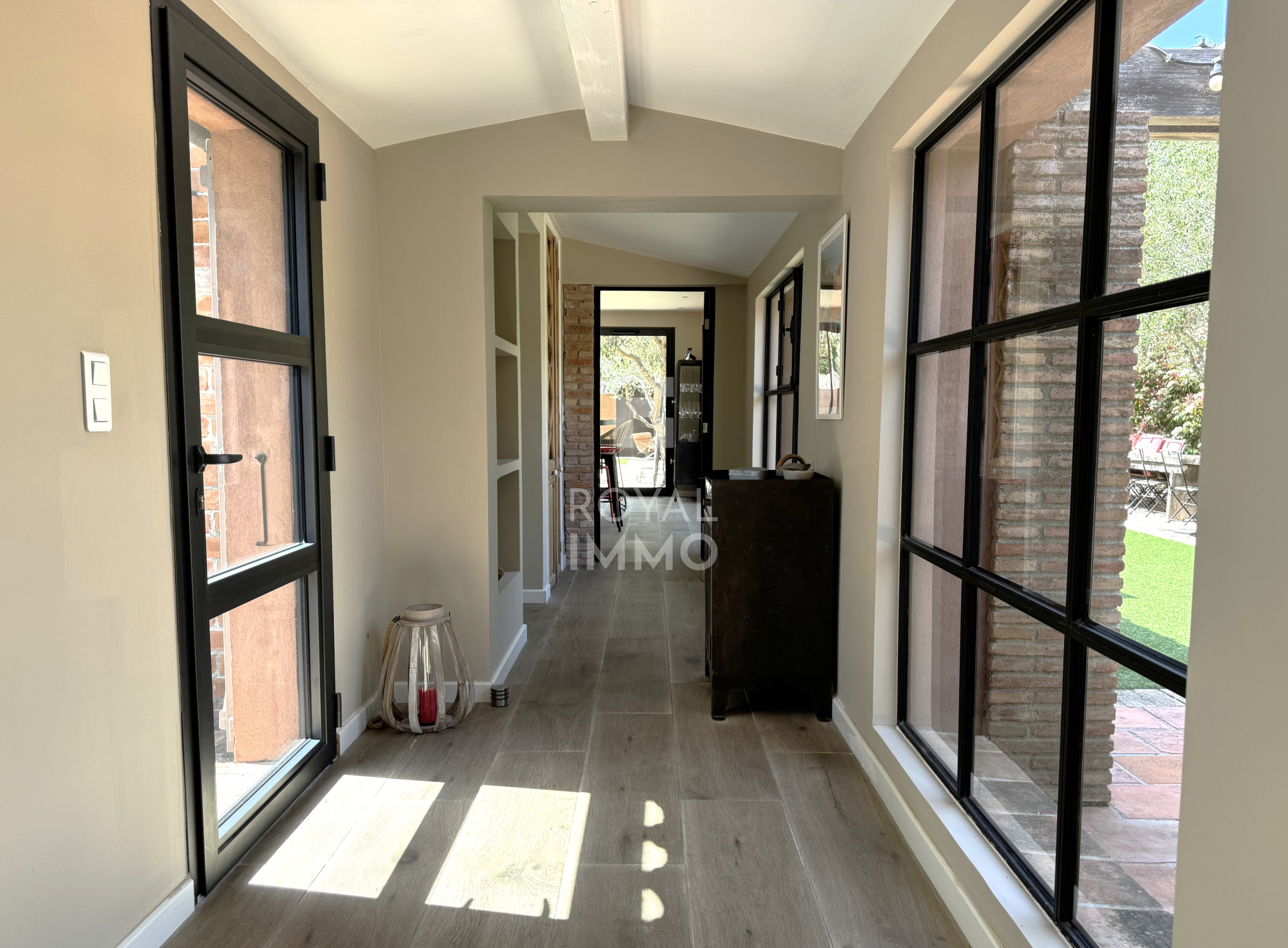 HYERES - L'ESTALLE - Nichée au coeur d'anciennes terres agricoles, cette propriété unique en son genre offre un cadre de vie authentique bercé par un calme absolu. Son architecture atypique aux aspirations d'haciendas andalouses mêle avec justesse des matériaux authentiques: pierres, briques et terres cuites s'entrelacent pour créer une atmosphère chaleureuse et intemporelle.