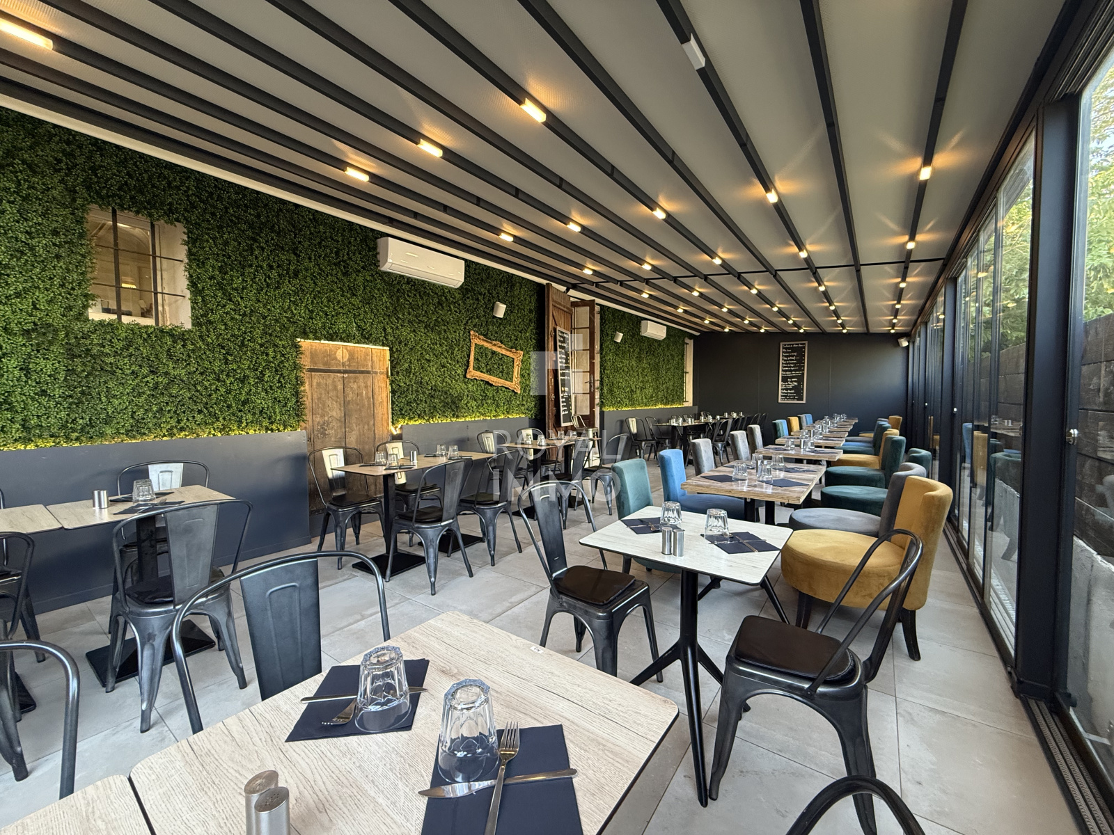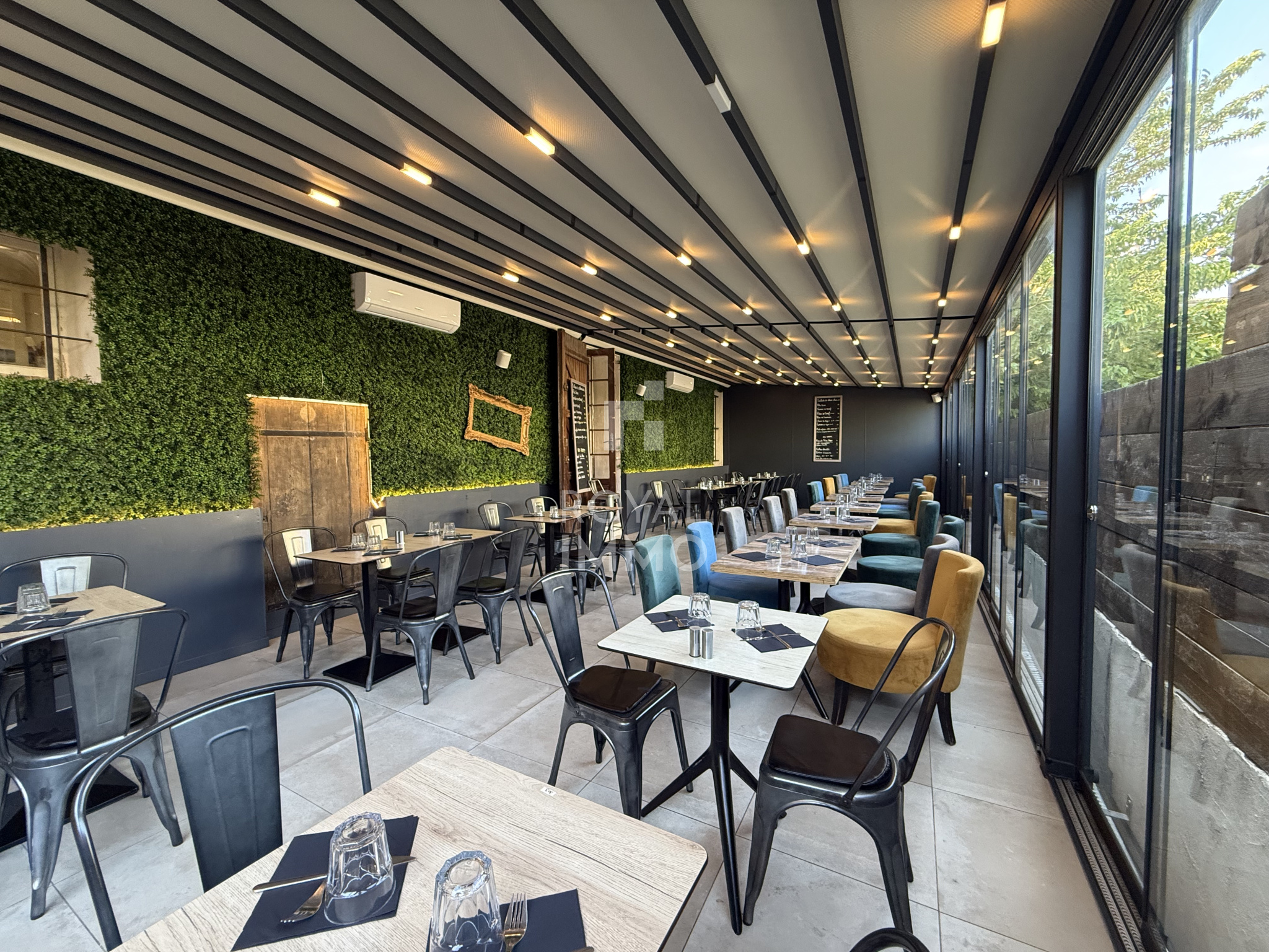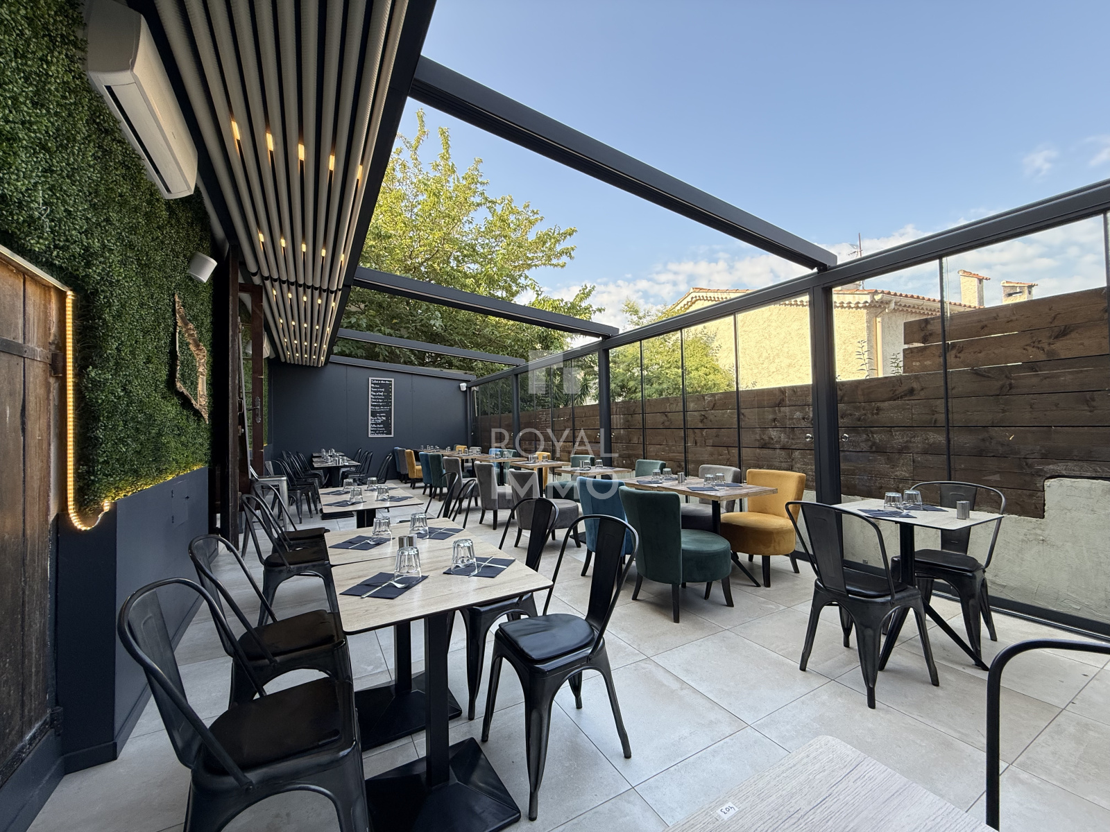 À l’extérieur, une superbe terrasse aménagée accueille la clientèle dans un cadre confortable et moderne, dotée d’une pergola bioclimatique neuve, avec système de sonorisation intégré et climatisation, permettant une exploitation optimale toute l’année.
