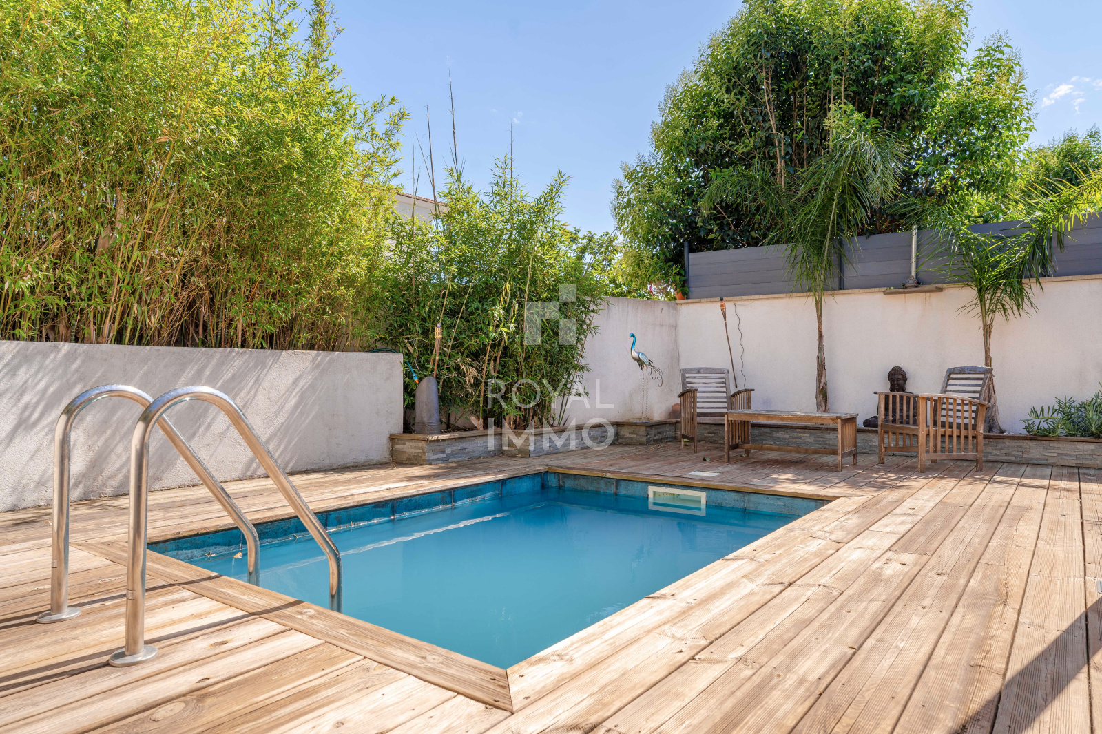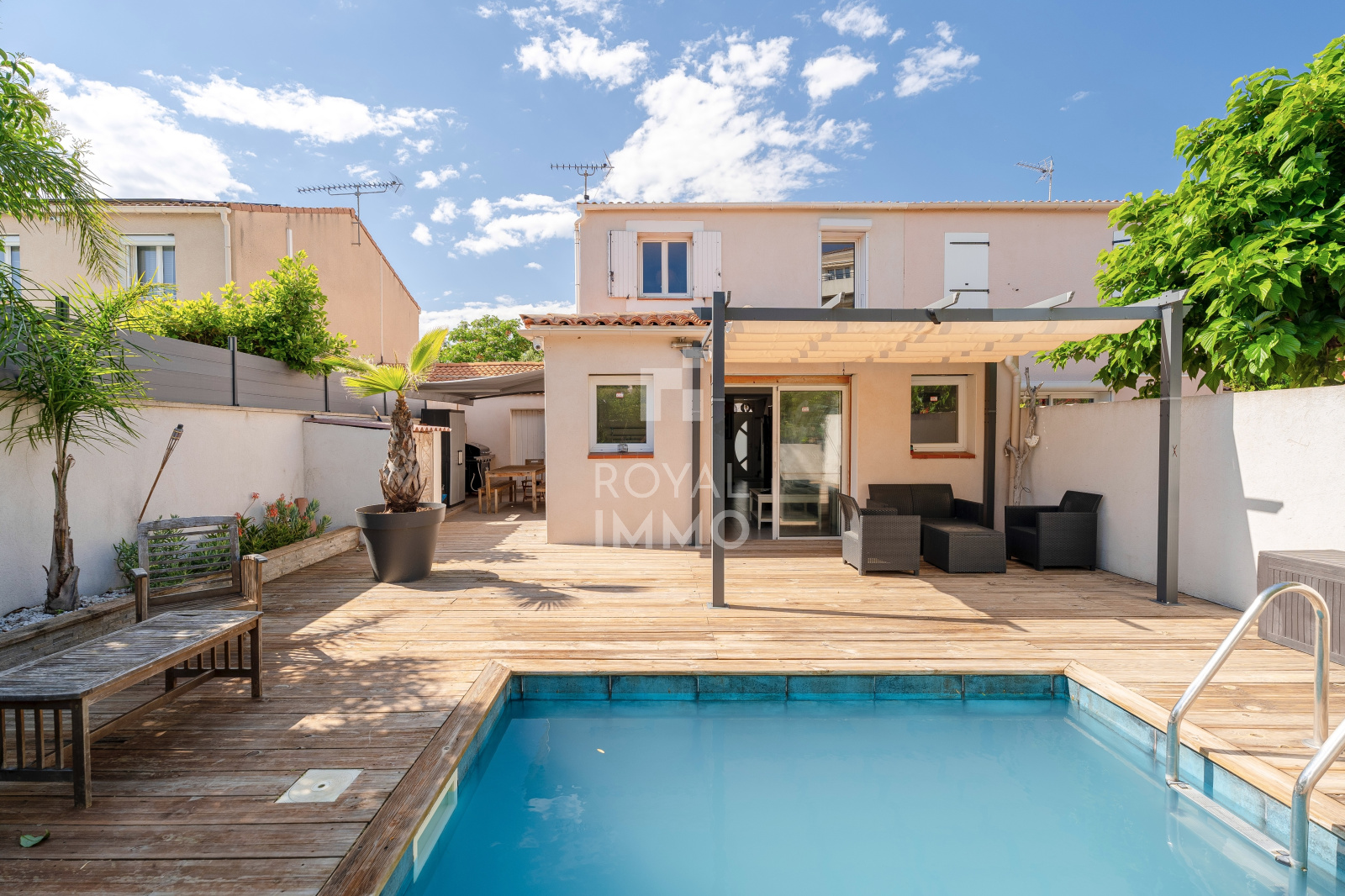 Un extérieur très agréable pour des moments conviviaux en famille ou entre amis notamment grace à une jolie piscine et un bel espace cuisine d'été/repas.