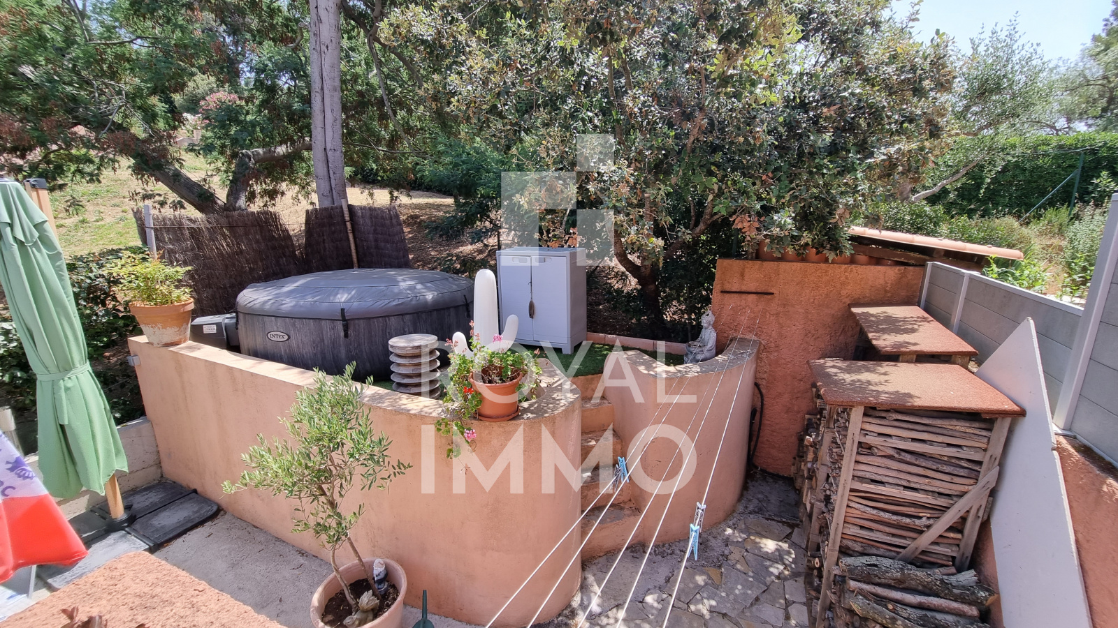 un jardin articulé en restanque vient compléter cette offre avec terrasse, un garage type Box, un débarras attenant et une place de parking privé aérienne.