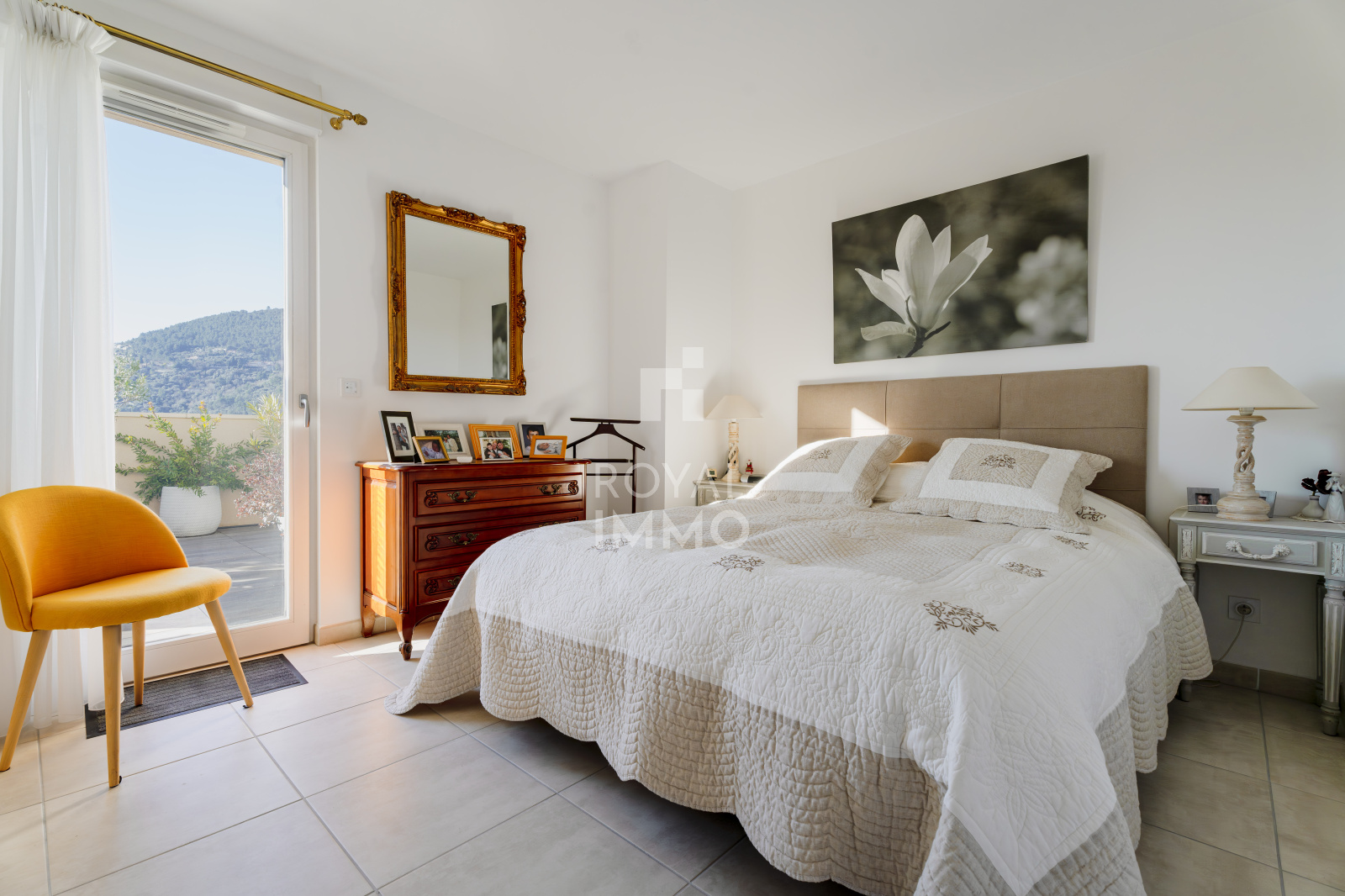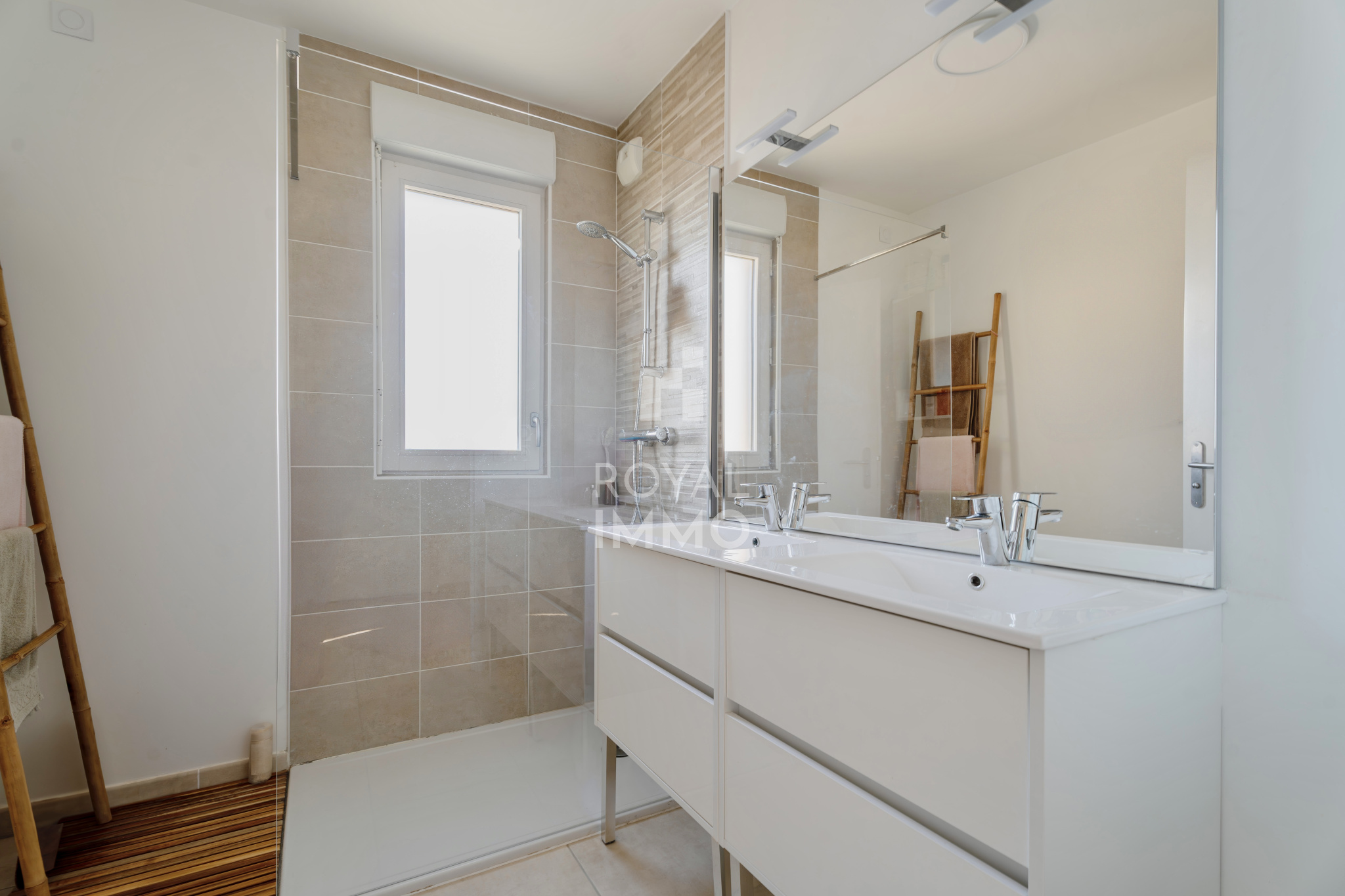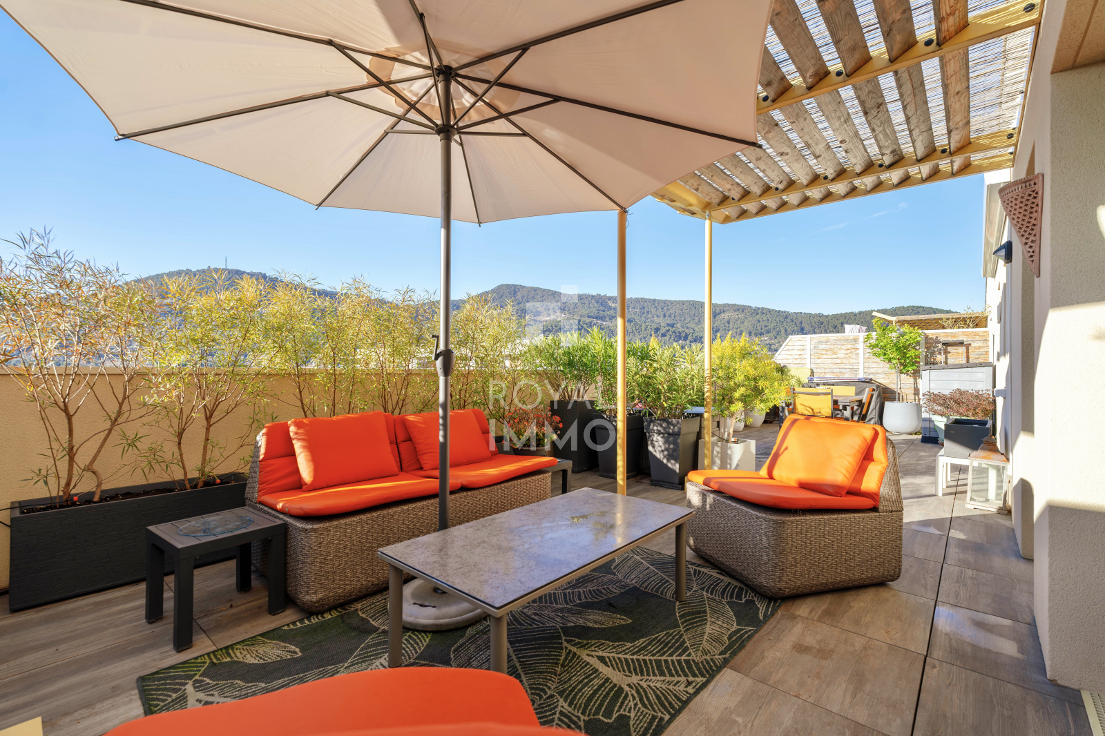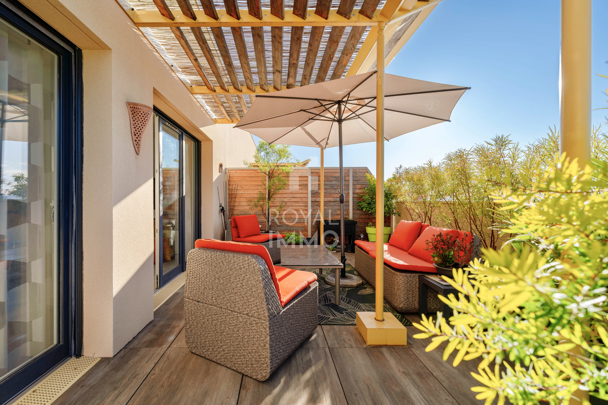 Il se compose de 2 belles chambres avec rangements, d’une pièce de vie généreuse et lumineuse ouverte sur un grand espace extérieur de 46,60 m2, idéal pour les repas en plein air et les moments de détente.