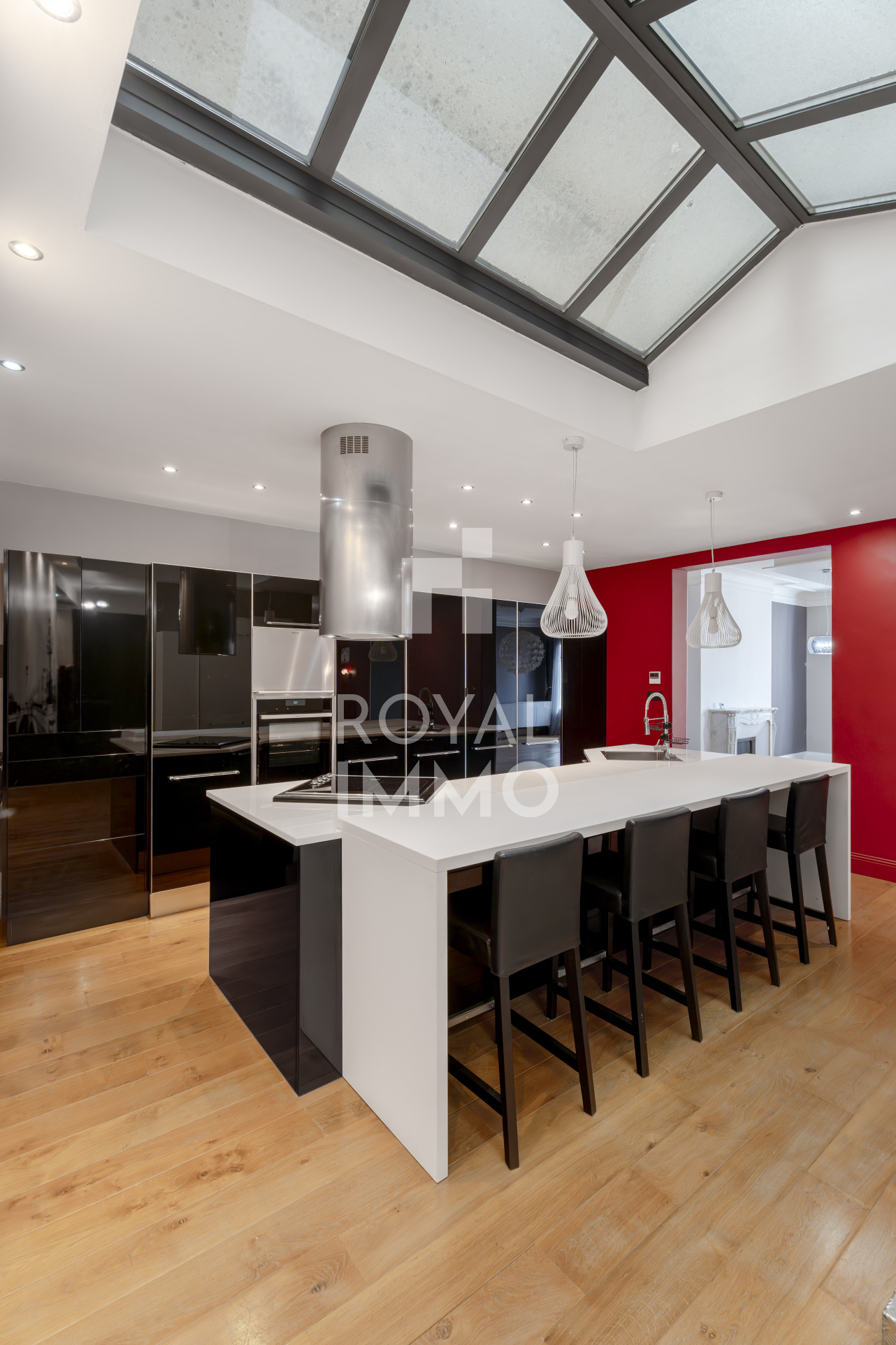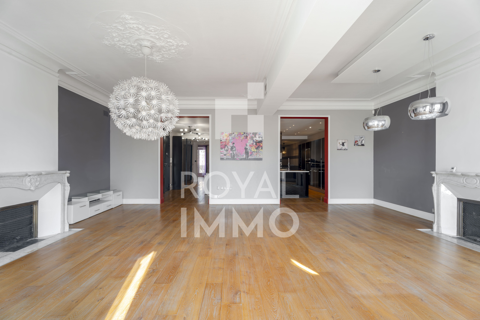 L’espace de vie, orienté plein sud, bénéficie d’une belle hauteur sous plafond et d’une lumière naturelle exceptionnelle. La cuisine américaine, entièrement équipée, s’ouvre sur un salon raffiné, idéal pour recevoir. L’appartement offre également quatre chambres avec rangements, une élégante salle d’eau avec douche à l’italienne double, un système de climatisation gainable, des cheminées en marbre, ainsi qu’une porte blindée pour une sécurité optimale.