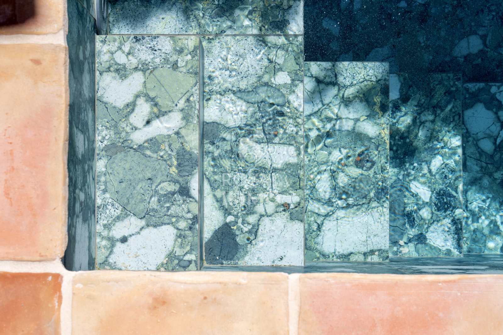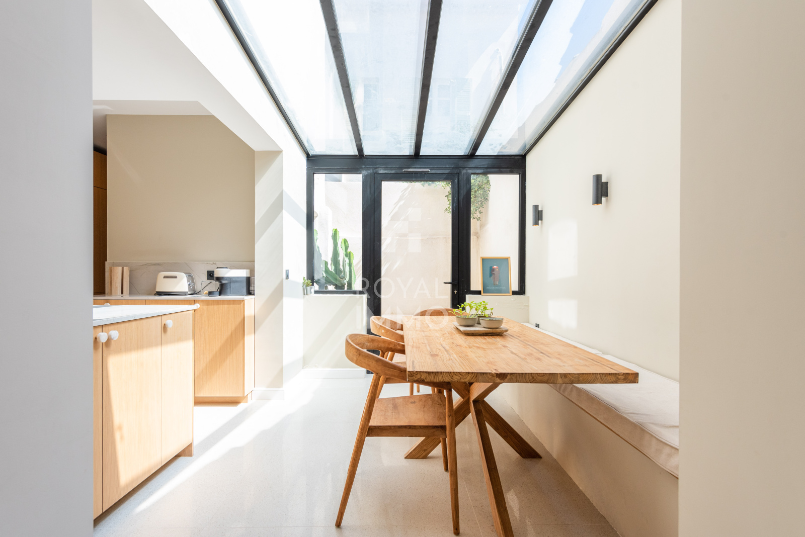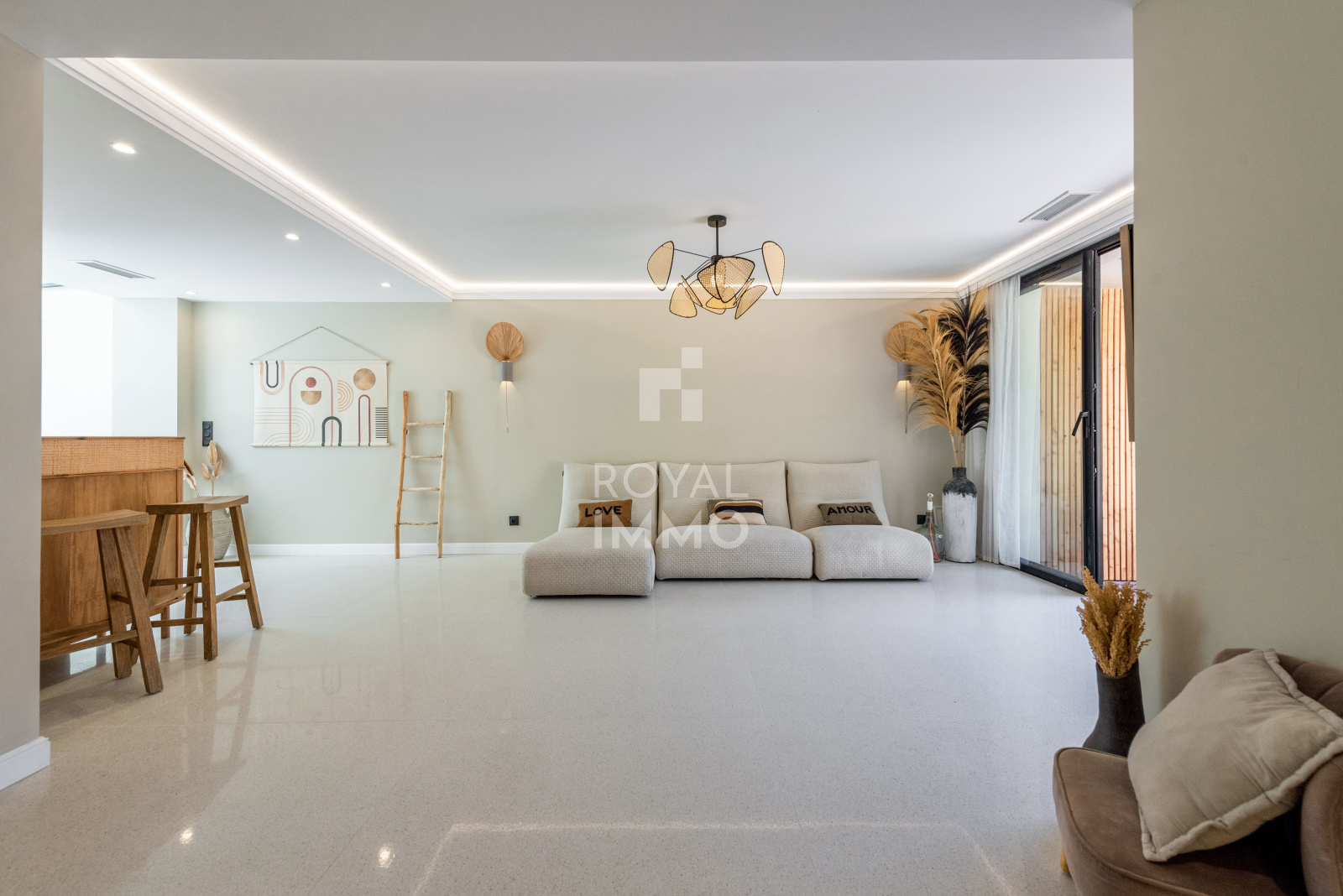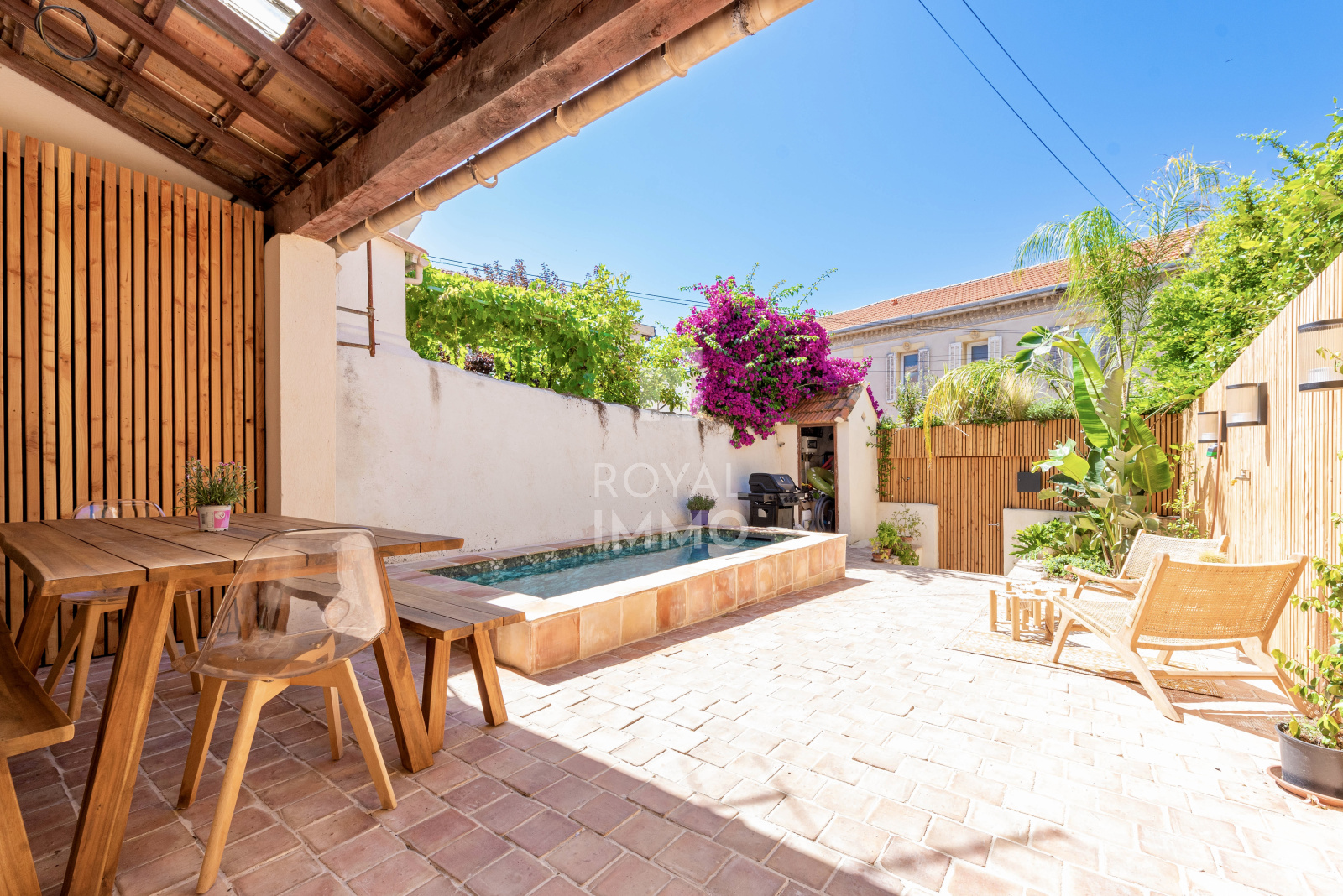 En entrant, vous trouverez un espace extérieur d'environ 50m² avec bassin type balinéen donnant sur l'entrée avec une belle pièce de vie, Wc indépendant, cuisine sous verrière avec patio, arrière-cuisine et buanderie.