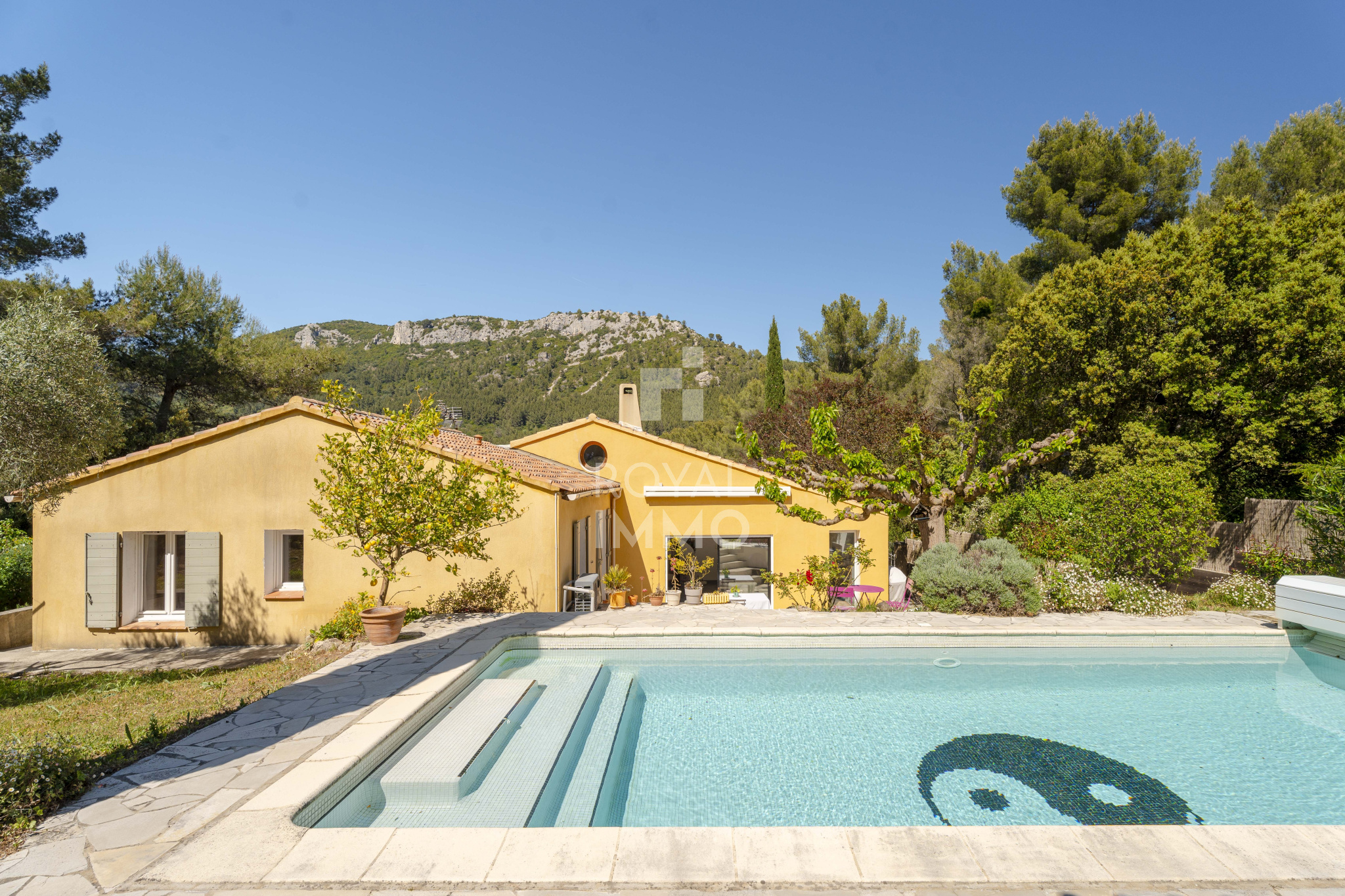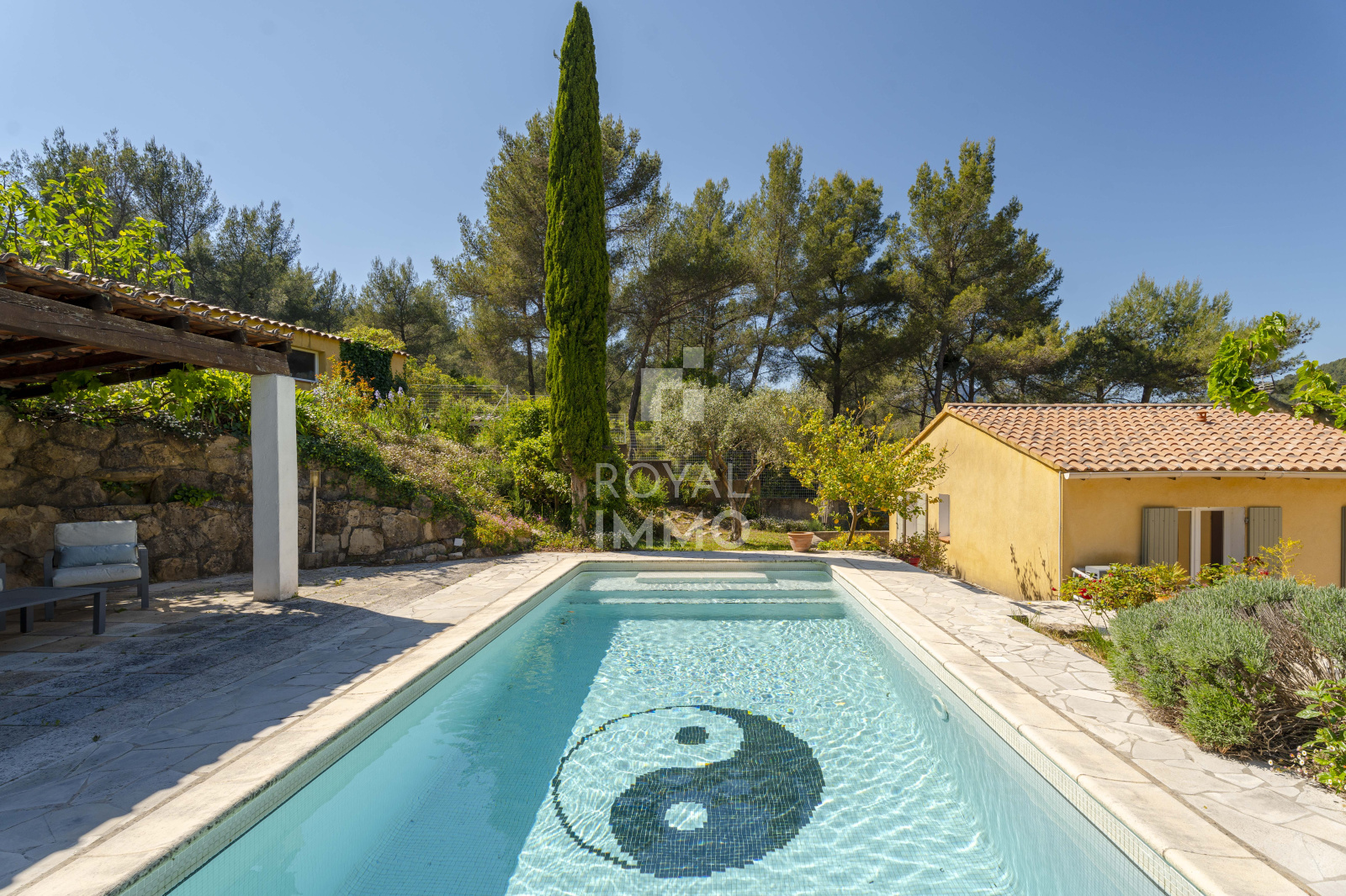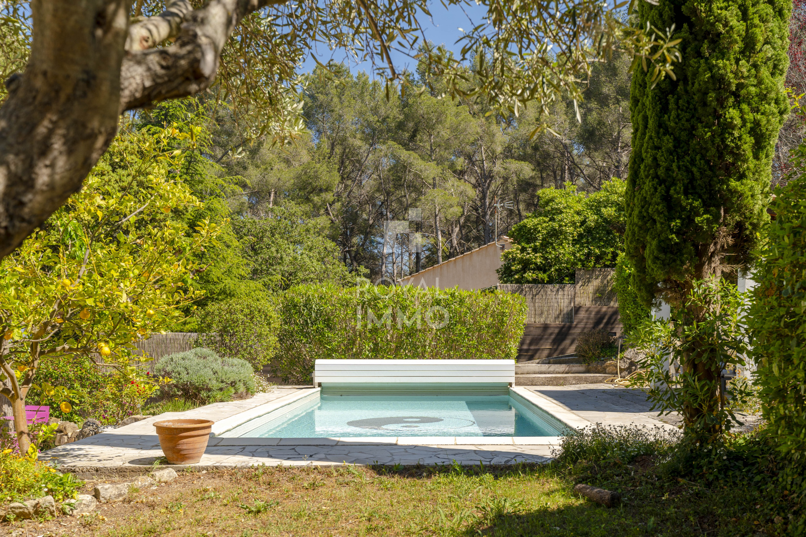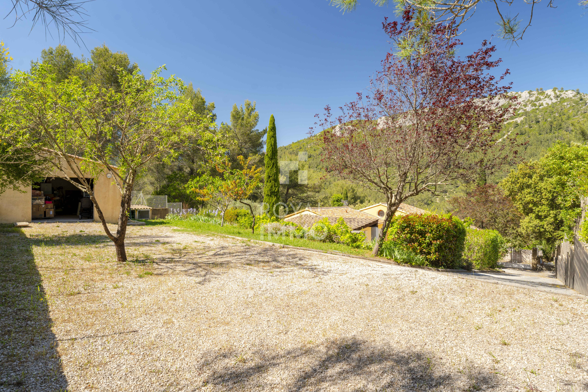 Le terrain, arboré et parfaitement entretenu, offre un cadre de vie paisible et intimiste :