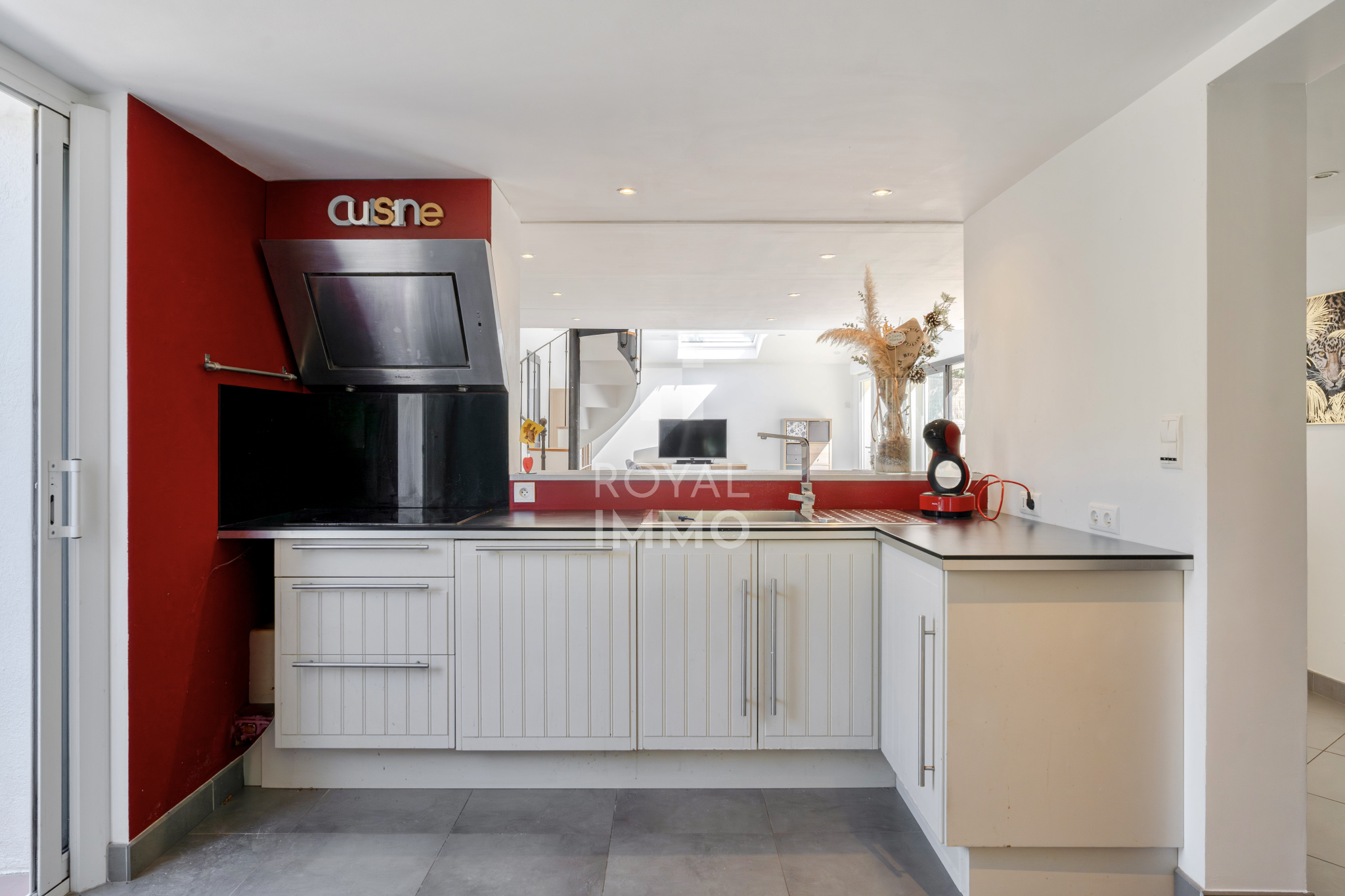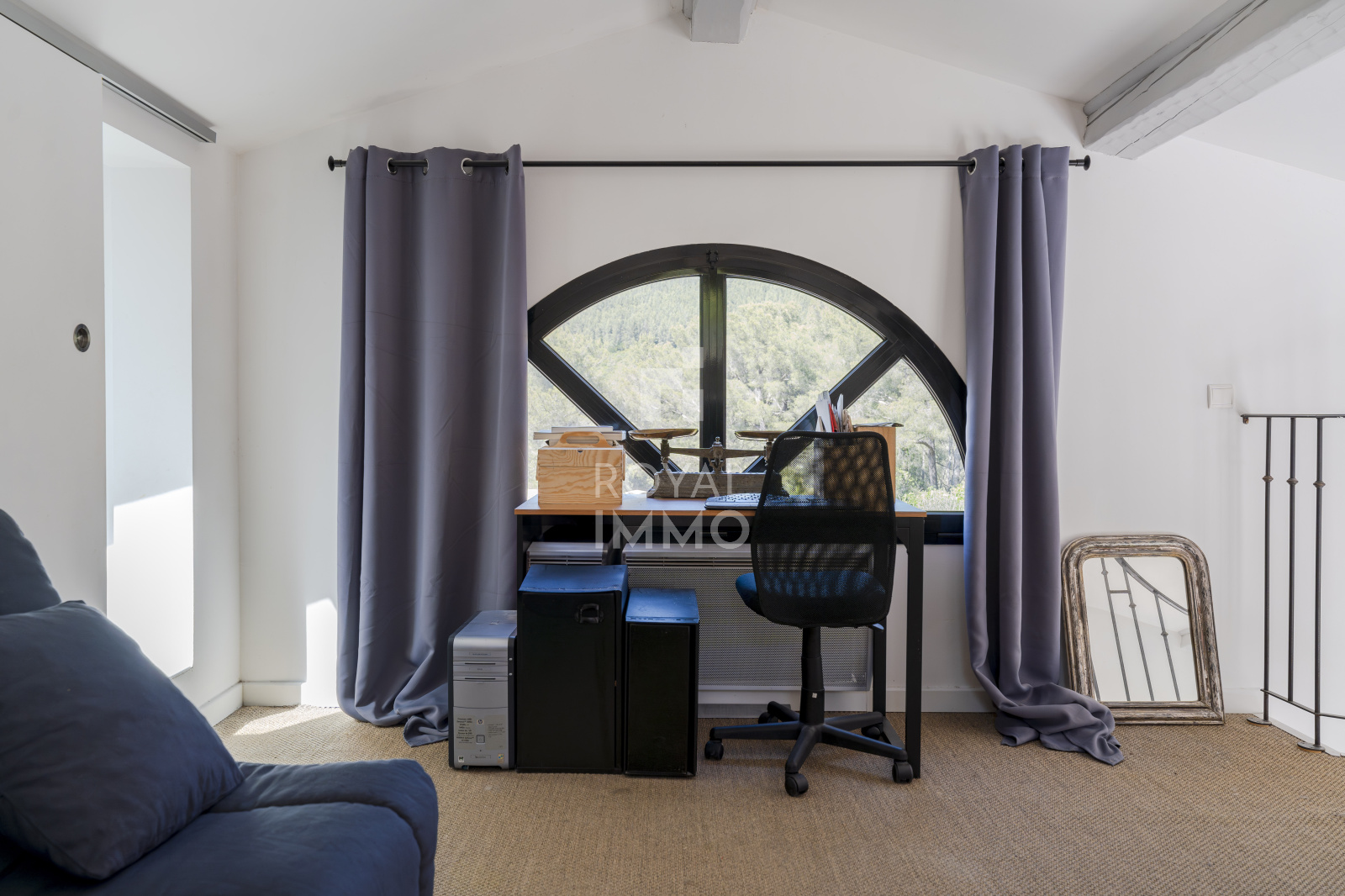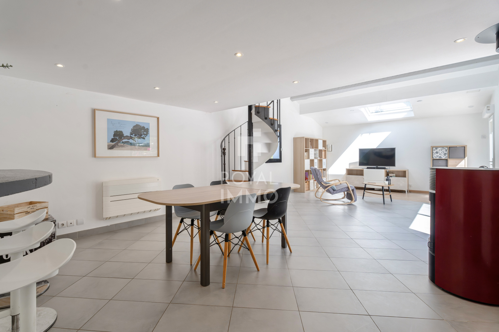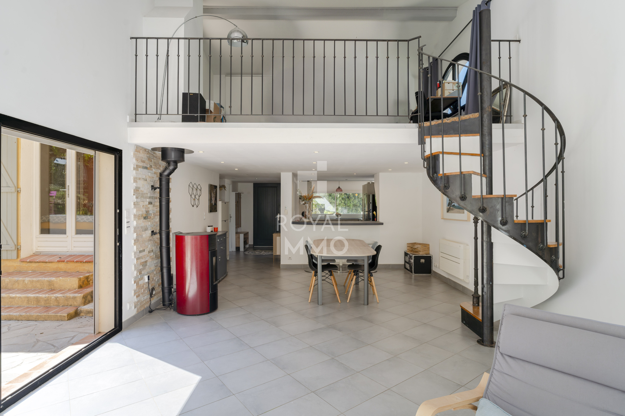 Une agréable mezzanine surplombe le séjour et accueille un espace bureau ainsi qu’une salle d’eau supplémentaire, idéale pour le télétravail ou un espace indépendant.
