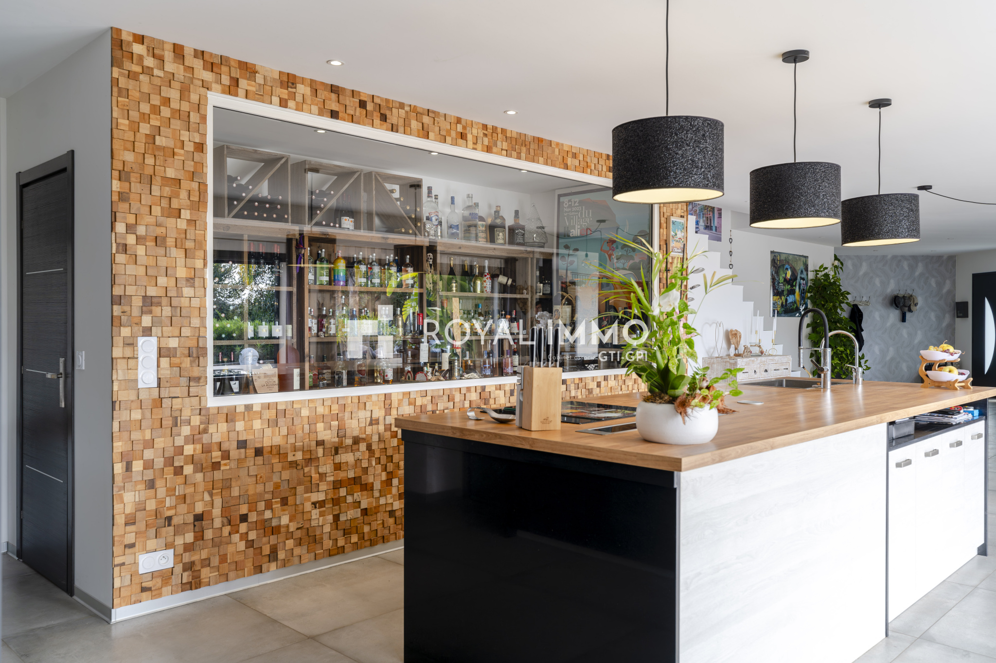Une pièce de vie spectaculaire avec cuisine américaine équipée et cave à vin, ouvrant sur une spacieuse terrasse exposée plein Sud